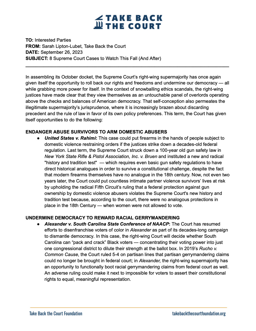Take Back the Court raises awareness about the urgent need to expand the number of seats on the Supreme Court to address the theft of the court by Senator Mitch McConnell during the Obama Administration. Without adding seats, Congress will not be able to restore the right to vote, ensure reproductive freedom, protect workers, halt our climate emergency, or pass new legislation. Court expansion, which can be accomplished without a constitutional amendment, is the only reform that enables the un-rigging of the system and the restoration of democracy. Learn more: https://www.takebackthecourt.today/