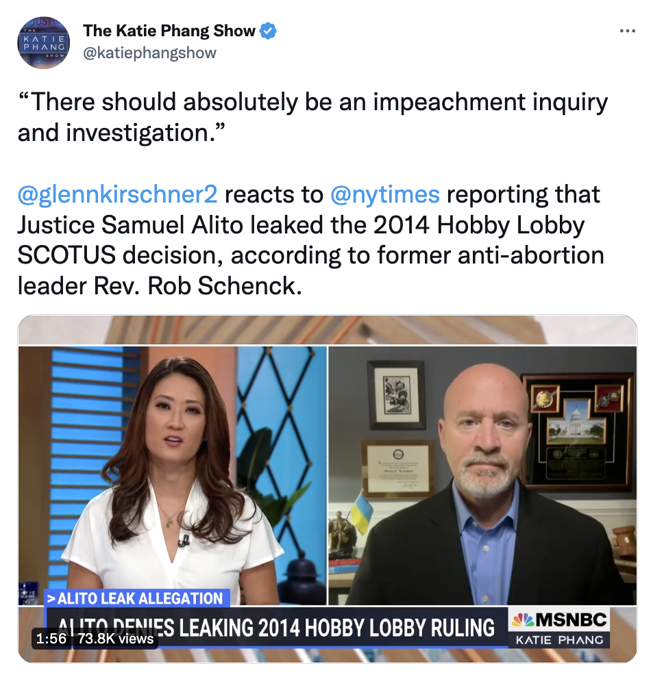 “The call is coming from inside the house at the Supreme Court, and obviously the justices can no longer be trusted to police themselves. Congress has to step up to its duty as a co-equal branch and conduct a swift, thorough investigation into whether one of the justices is systemically leaking sensitive information to right-wing political allies,” said Take Back the Court Action Fund Executive Director Sarah Lipton-Lubet on Saturday morning, shortly after the news broke.