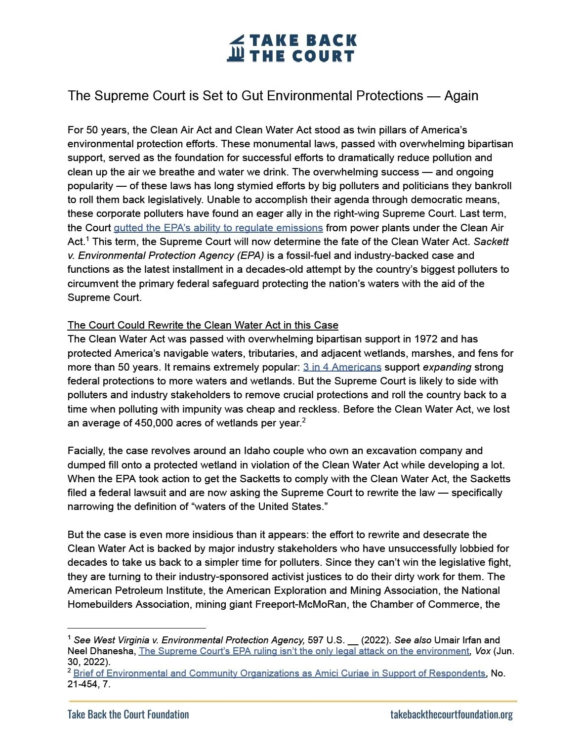 Beyond the devastation to water quality, communities, and the environment, this case fits into a broader war on the government’s ability to meet today’s most pressing challenges — and aligns with the radical Court’s plot to repeal the major advancements of the 20th century. The conservative justices are actively complicit in an anti-regulatory mission that goes beyond environmental threats: our social safety nets, anti-discrimination protections, voter safeguards, and workplace regulations are all on the chopping block this term as the Supreme Court races to enact one-party, minority rule from the bench. Only rebalancing and expanding the Supreme Court can end this Court’s insidious, radical, and deadly opinions from continuing for decades to come. Our memo shows just what is at stake in this monumental case for our rights and our waters: